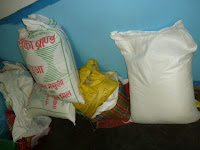 E lá vamos nós para compras de peso na cidade: arroz, batatas, lentilhas, feijão, grão, ervilhas, farinha, sal, açúcar, cebolas, alhos, gengibre, óleo, massas, ovos, bolachas, leite em pó, chá, café, arroz batido, cereais... Não esquecendo um saco de ração para as galinhas. Estas compras, para além de muitas e variadas especiarias, bem como produtos de limpeza para a casa, são efetuadas, de preferência, para um consumo mensal.